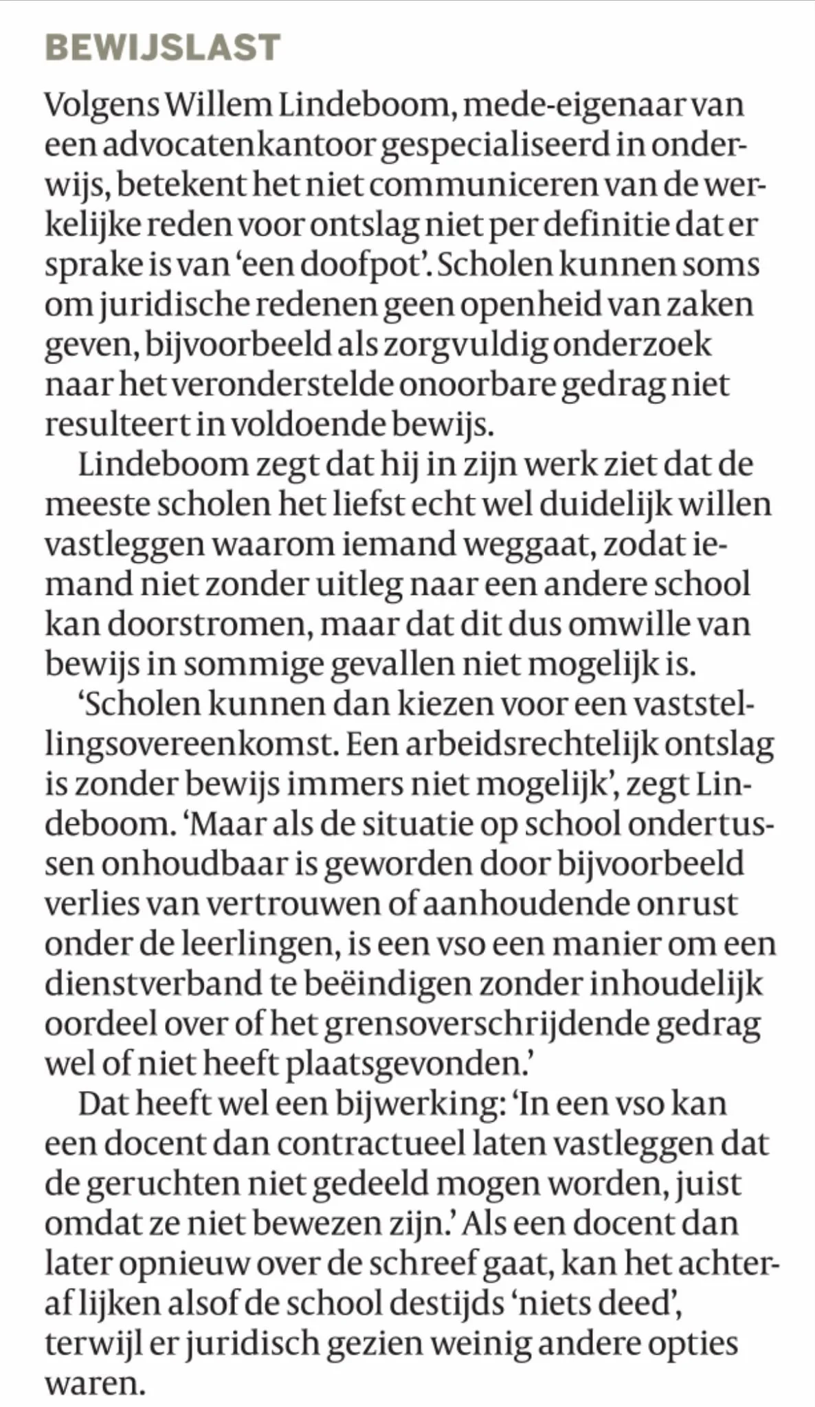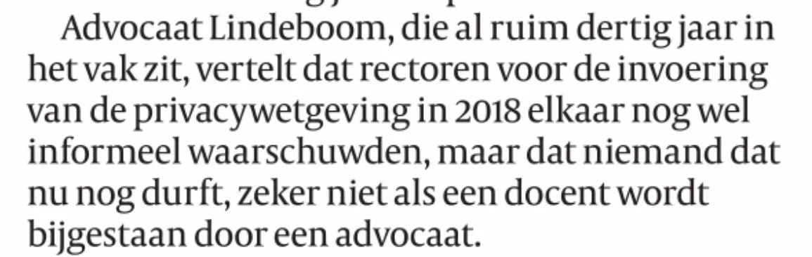 De journalist heeft ons kantoor om commentaar gevraagd. Wij behandelen nu eenmaal ook regelmatig dit soort zaken. De vraag of scholen situaties van seksueel wangedrag onder het tapijt schuiven om reputatieschade te voorkomen hebben wij ontkennend beantwoord. Ons advies aan scholen zal altijd zijn om meteen de vertrouwensinspecteur te benaderen, serieus onderzoek te verrichten en zo nodig meteen maatregelen te nemen. Zeker na #MeToo ga je pas echt reputatieschade lijden als blijkt dat je dit soort zaken probeerde te verbloemen.
